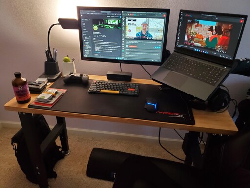 Here is my current setup. My laptop is an incredible gaming device but I’m kind of hung up on the fact that I don’t much enjoy gaming at my desk. I much prefer to game in a lounging position where I can put my feet up. Because of this, I’m considering splitting my priorities for gaming and browsing into separate devices.